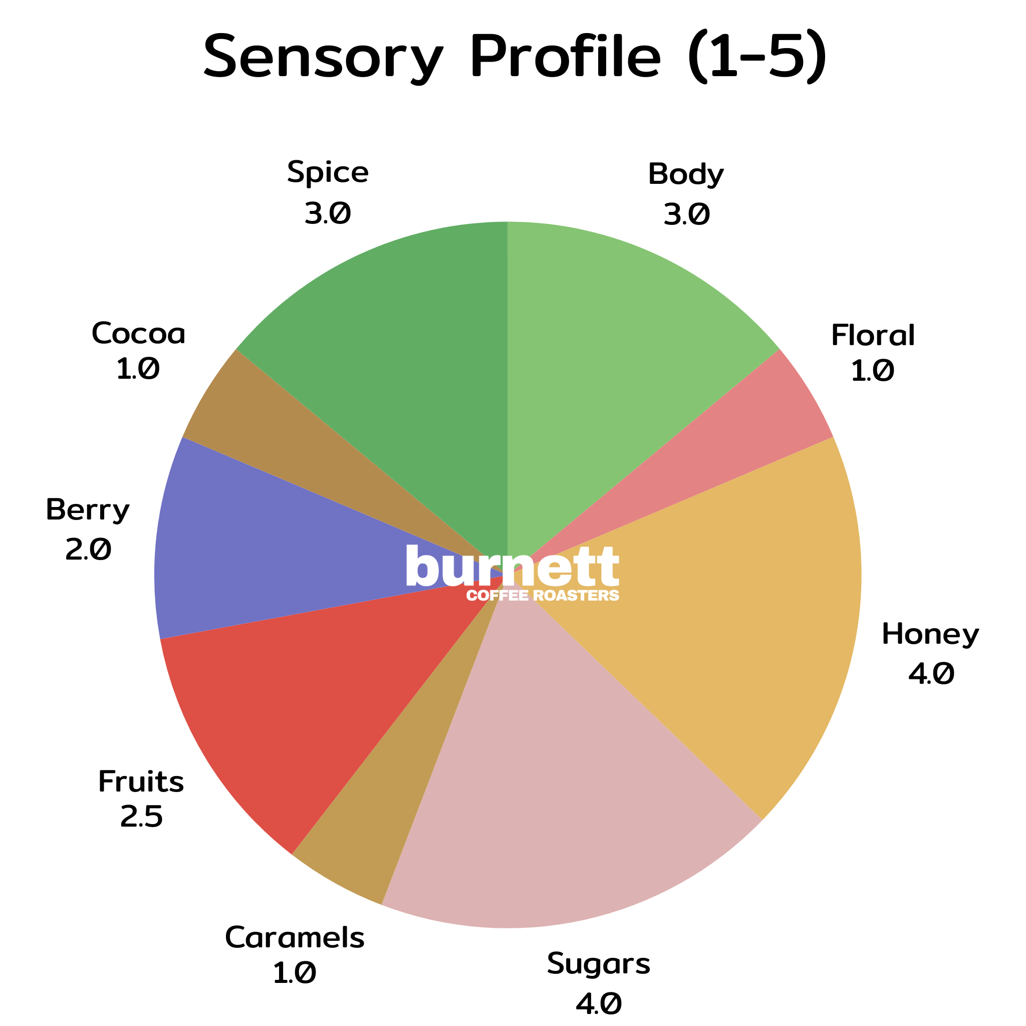 Light Roast — Honeyed sweetness, juicy pear and red berries, delicate chamomile tea, bright and syrupy mouthfeel.