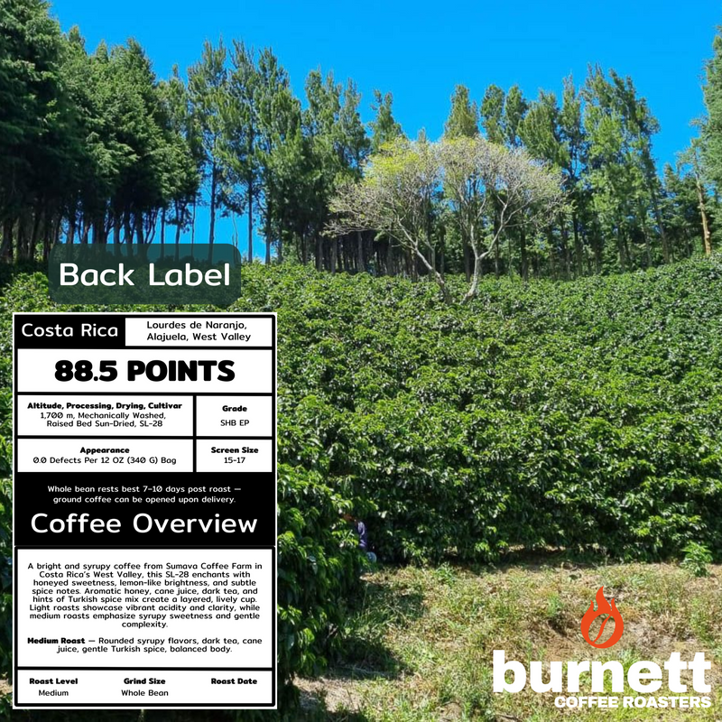 A bright and syrupy coffee from Sumava Coffee Farm in Costa Rica’s West Valley, this SL-28 enchants with honeyed sweetness, lemon-like brightness, and subtle spice notes. Aromatic honey, cane juice, dark tea, and hints of Turkish spice mix create a layered, lively cup. Light roasts showcase vibrant acidity and clarity, while medium roasts emphasize syrupy sweetness and gentle complexity.