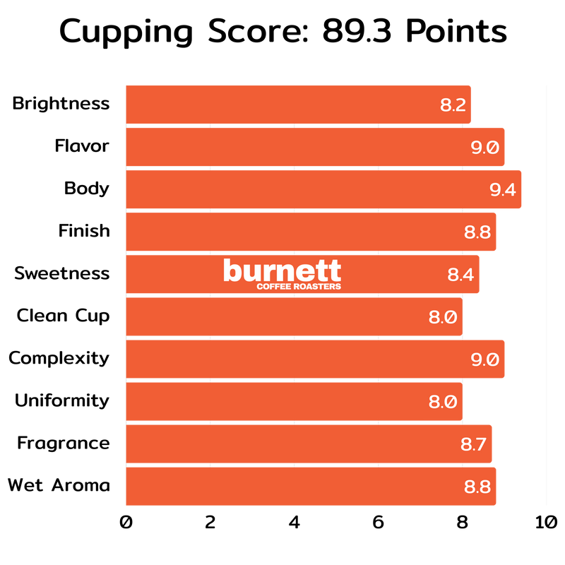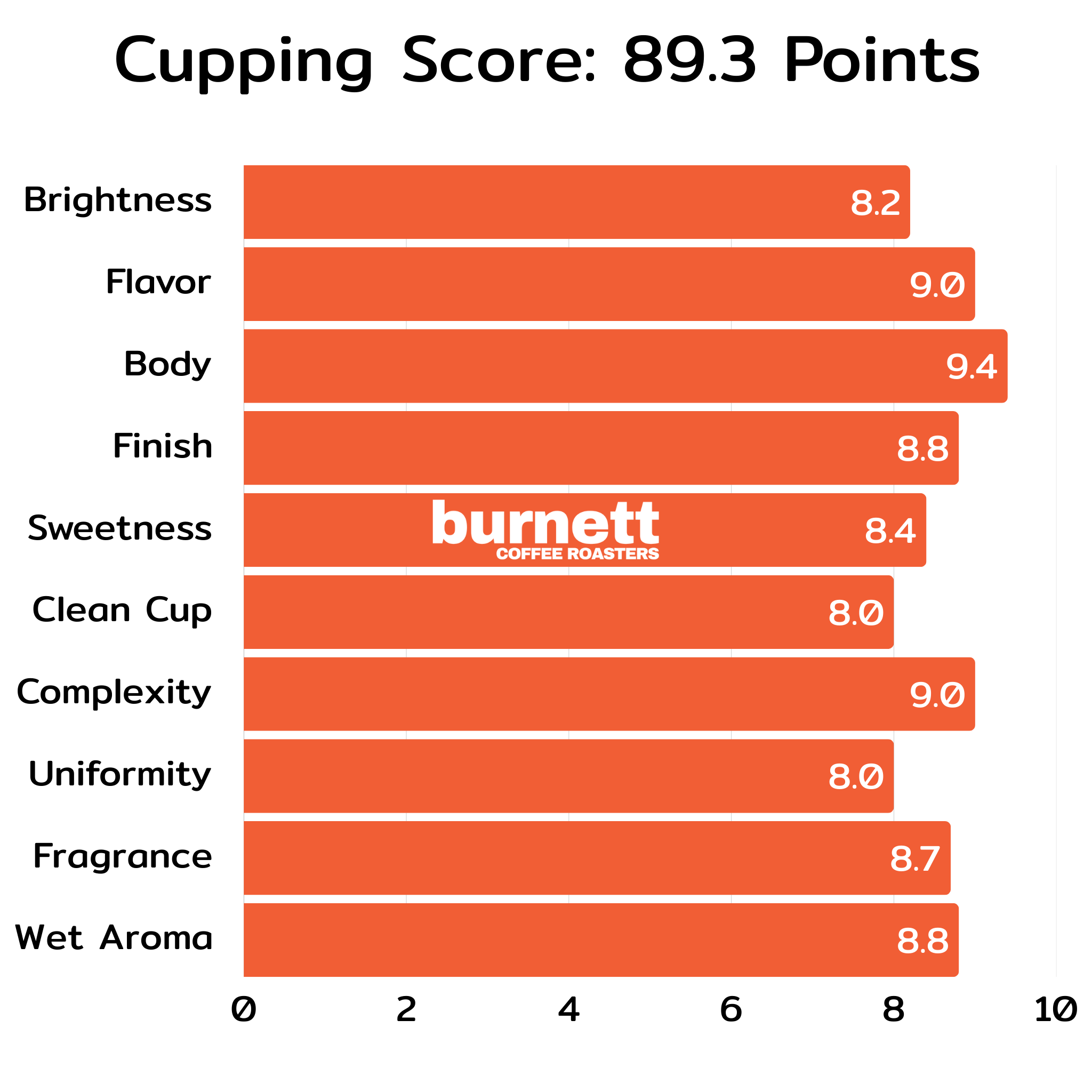 Cupping Score — 89.3 Points (Excellent specialty-grade coffee with layered fruit, spice, and bittersweet complexity)