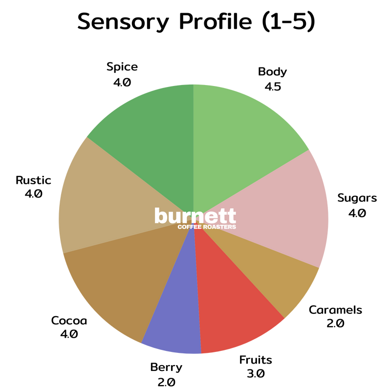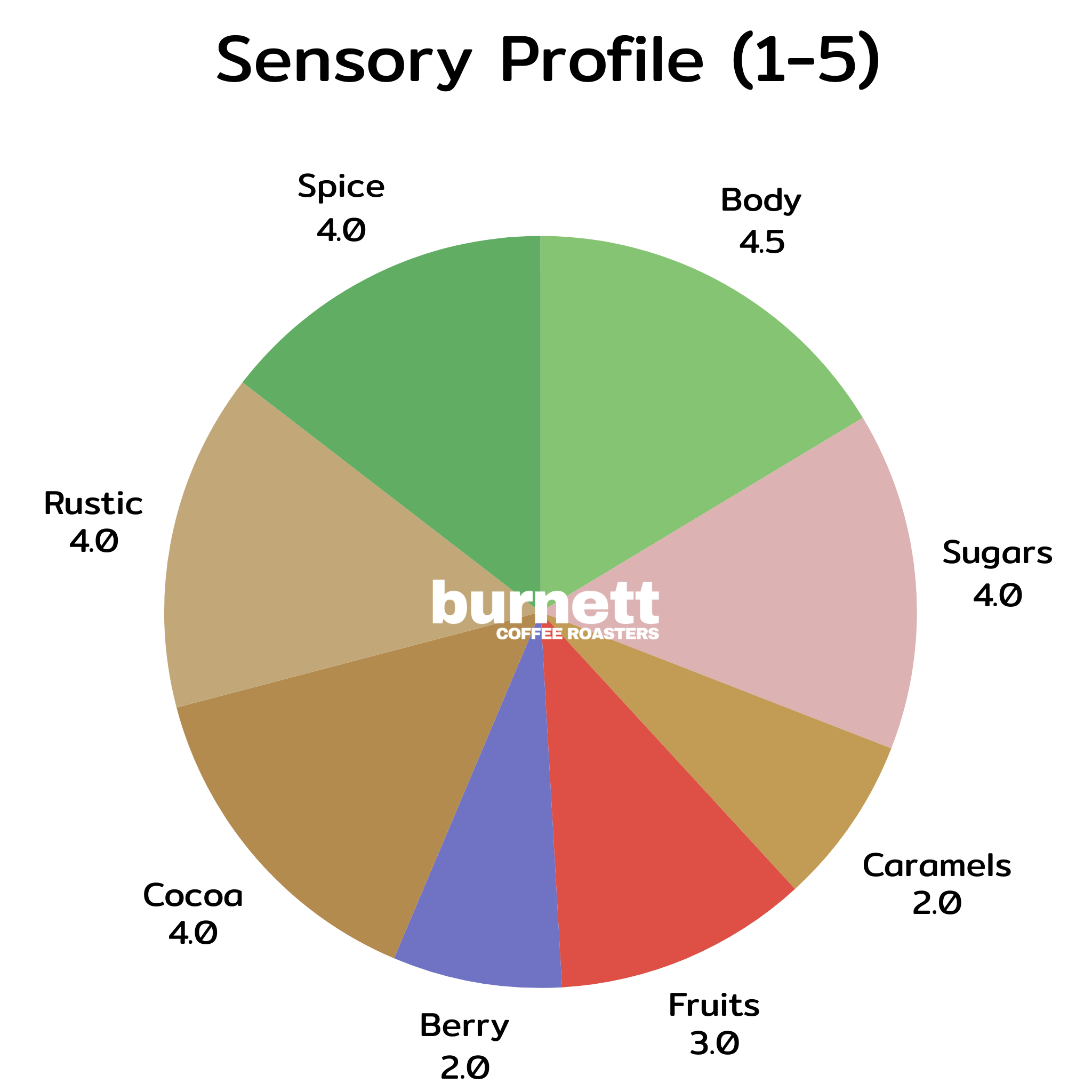Light Roast — Rustic fruit intensity, honeyed sweetness, bright spice, syrupy body.