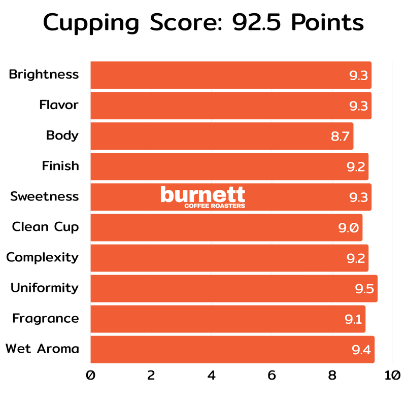Cupping Score — 92.5 Points (Very high-scoring, vibrant, well-balanced cup with striking clarity, sweetness, and bracing citrus)
