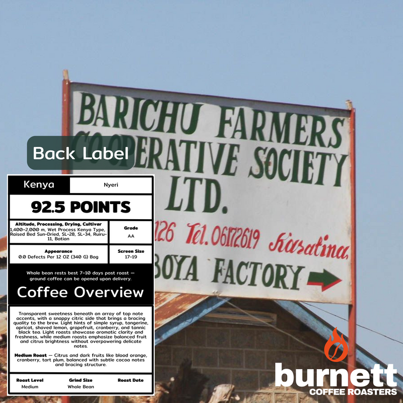 Sourced from Gatomboya Coffee Factory, part of the Barichu Farmers Cooperative Society in Nyeri, Kenya — a region spanning 1,400–2,000 m above sea level. Cooperative members bring cherries to the wet mill for pulping, fermenting, washing, and drying, producing coffee with clarity, vibrant fruit, and bracing acidity. Varietals include SL-28, SL-34, Ruiru-11, and Batian, carefully separated by size. AA is the largest seed size, commanding the highest quality and price, and consistently produces exceptional Kenya coffees.