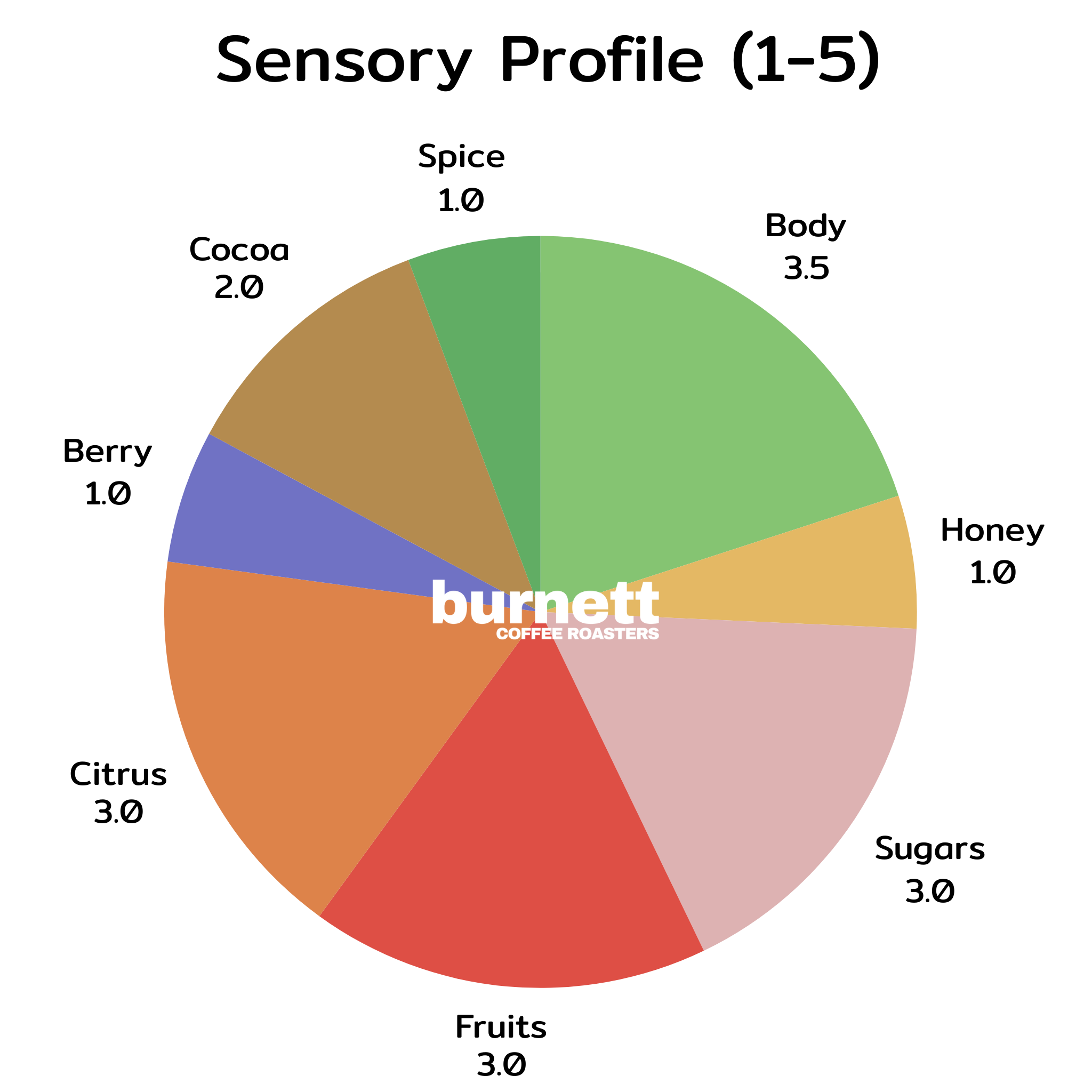 Transparent sweetness beneath an array of top note accents, with a snappy citric side that brings a bracing quality to the brew. Light hints of simple syrup, tangerine, apricot, shaved lemon, grapefruit, cranberry, and tannic black tea. Light roasts showcase aromatic clarity and freshness, while medium roasts emphasize balanced fruit and citrus brightness without overpowering delicate notes.